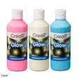 Glow-in-the-dark paint lights up dark environments with shades of green/blue-green. Glow-in-the-dark paint uses a substance called phosphorescent and works by absorbing light, similar to a recharging battery. Daylight/white light "charges" best but blacklight can also be used and the luminescent paint can thus light up by itself as long as other lights are off. Glow in the dark paints come in different colours but have the brightest light with the default colour green/blue-green.