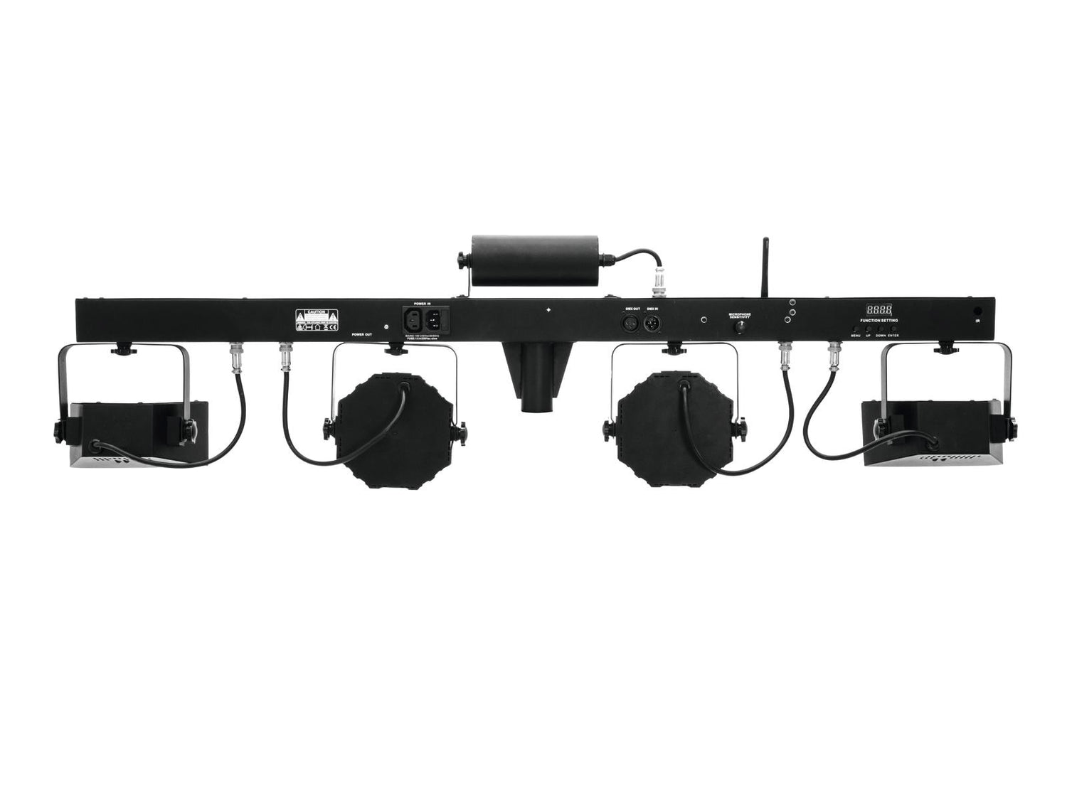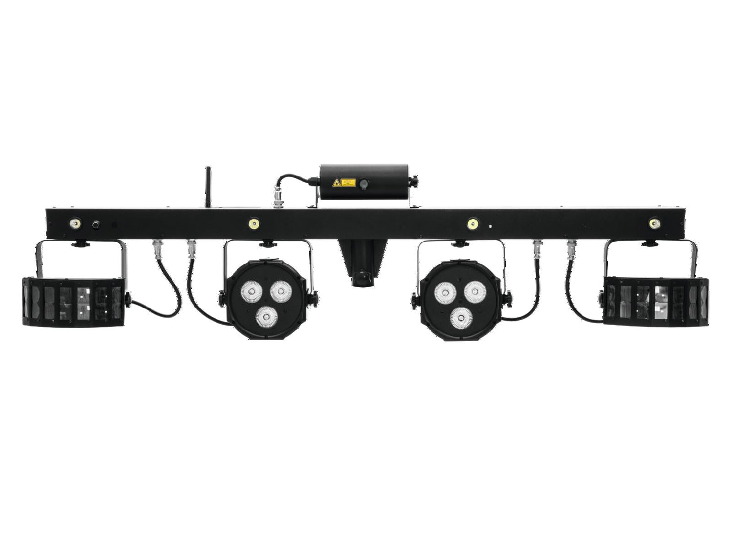 - 4-in-1 DMX light effect bar with laser, 2 rotating LED derbies, 2 LED spots and white strobe LEDs