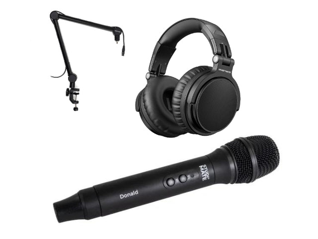 Pakkaus sisältää: 1x Donald USB-mikrofoni, 1x mikrofonipidike, 1x 1,8 m kaapeli, 1x käyttöohjeet