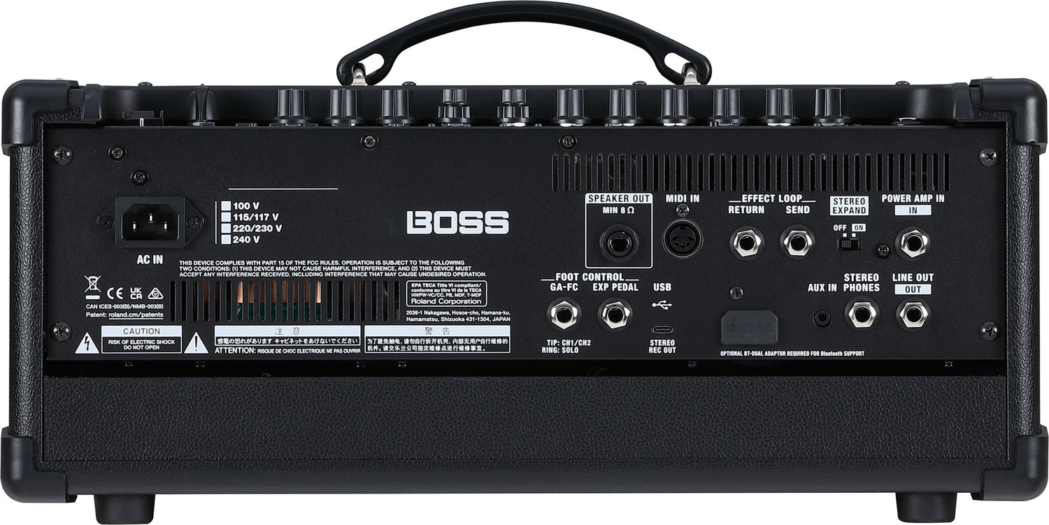 Stereo 1/4-tuuman puhelintyyppinen EXP PEDAL -liitäntä: 1/4-tuuman TRS-puhelintyyppinen GA-FC/CTL CH1/CH2 SOLO -liitäntä: 1/4-tuuman TRS-puhelintyyppinen AUX IN -liitäntä: Stereo miniatyyripuhelintyyppinen USB-portti: USB C-tyyppinen MIDI IN -liitäntä ADAPTOR SLOT: Audio MIDI Dual Adapter AC IN -liitäntä AC IN -liitäntä