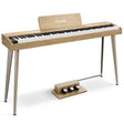 Kaunis ja minimalistinen Donnerin sähköpiano 88 puolipainotettua koskettimia Sisältää sustain-, damper- ja sostenuto-pedalit Sisäänrakennetut kaiuttimet