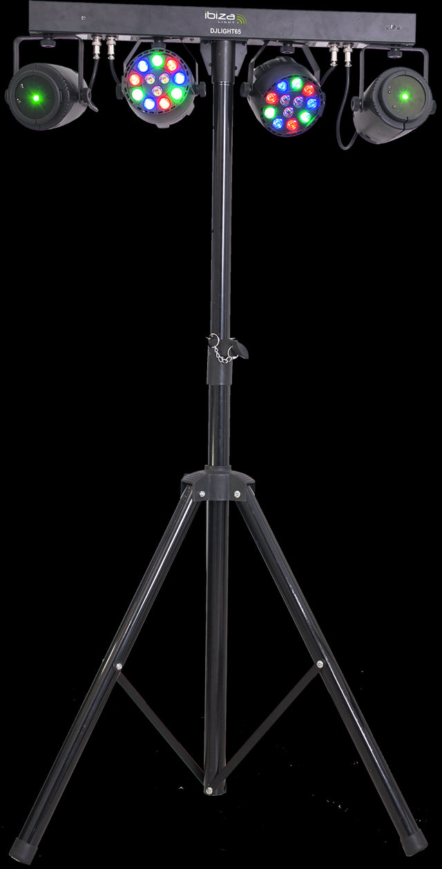 Täydellinen valopalkki johon sisältyy liukumaton jalusta mustalla viimeistelyllä helppoa asennusta varten. Setti sisältää 2x LED-parlamppua 12x 1W RGBW LEDillä ja 2x 130mW laseria kauniilla tähtikuvioilla punaisissa ja vihreissä väreissä.
