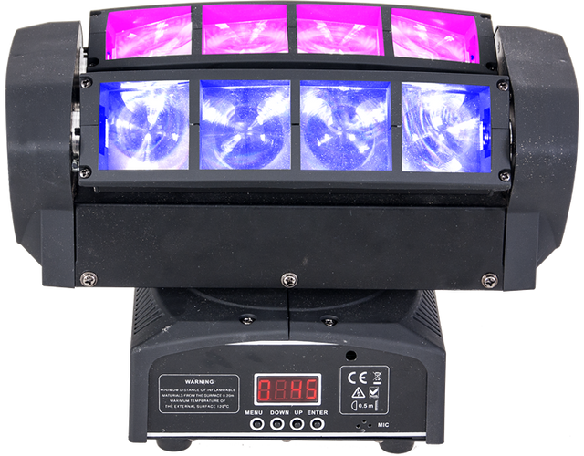 Ibiza Spiderilla saat moving head -valon, joka luo kauniita ja dynaamisia pyyhkäisytehosteita 2x 4 linssillä varustetulla LED-palkeilla, joissa on RGBW jaettuna 8 vyöhykkeeseen.