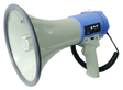 Megafoni on valmistettu vankasta ABS-muovista, ja siinä on sireenitoiminto ja säädettävä olkahihna.
