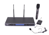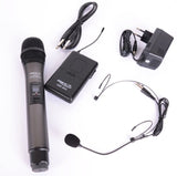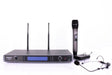Dette trådløse sæt består af 1 x UHF håndholdt mikrofon, en UHF bæltsender, et headset og 1 x UHF dual modtager.