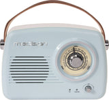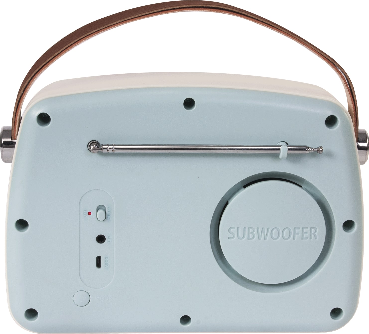 Trendikäs radio, jossa on sisäänrakennettu ladattava akku, joka lataa USB:n kautta.