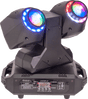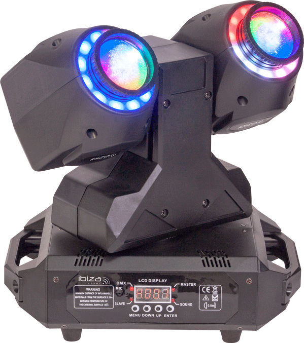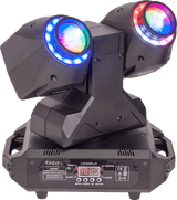 Tämä kaksinkertainen liikkuva pää täyttää huoneen erityisen värikkäillä efekteillä, jotka on luotu 2 x 12 RGB SMD5050 LED:llä, luoden pesuvaikutuksen, ja 2 tehokkaalla 30W 4-in-1 RGBW LED:llä, jotka luovat säde-efektin.