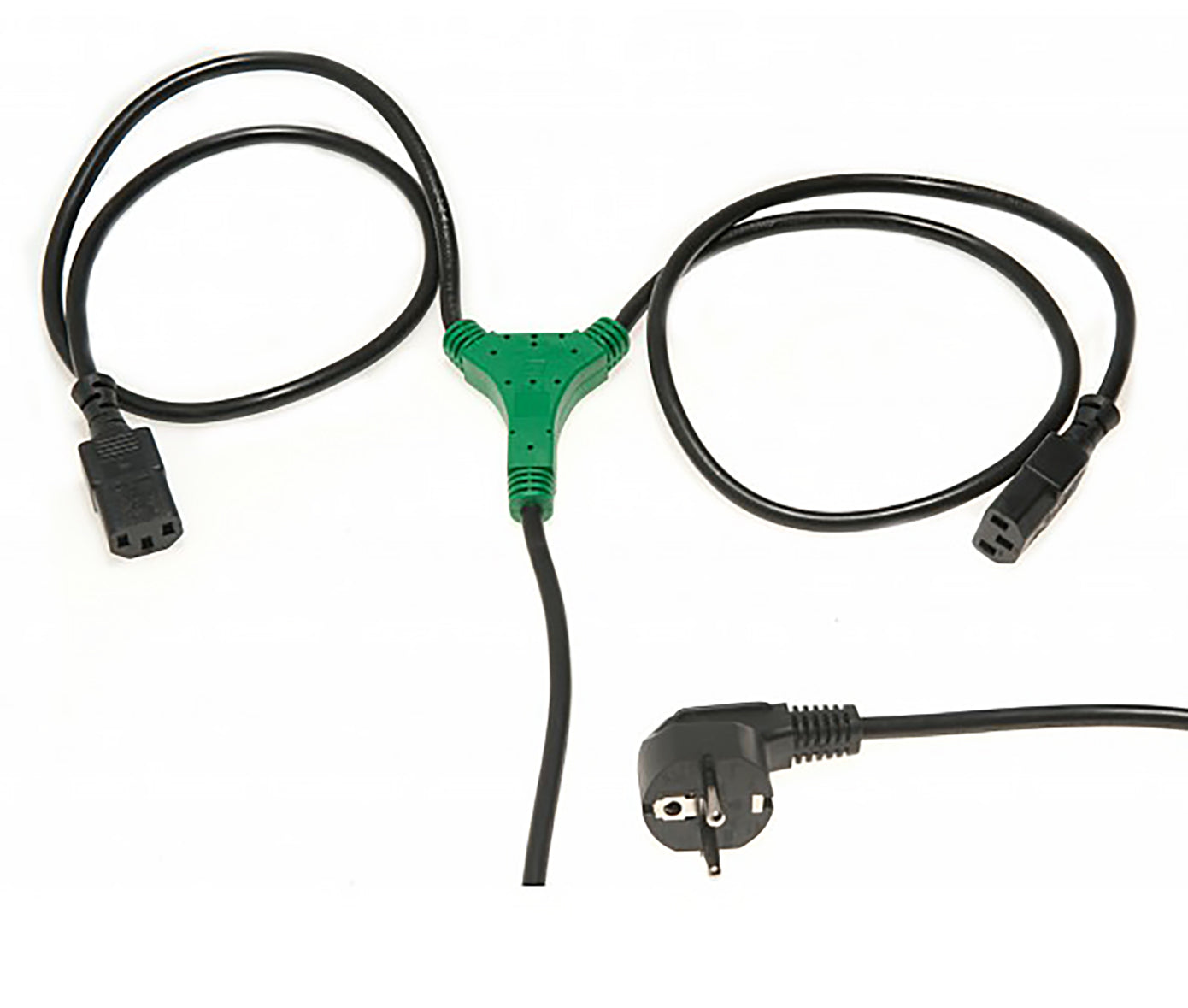 Y-split-liitin, jonka toisessa päässä on schuko ja toisessa päässä 2 x IEC 13A:n naaraslaiteliitin .
