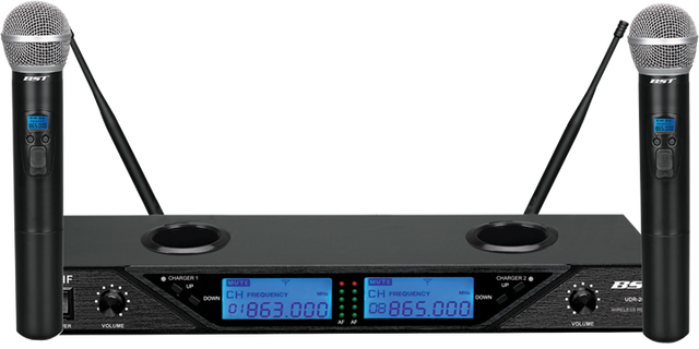 - Mukana toimitetaan 2 langatonta käsimikrofonia