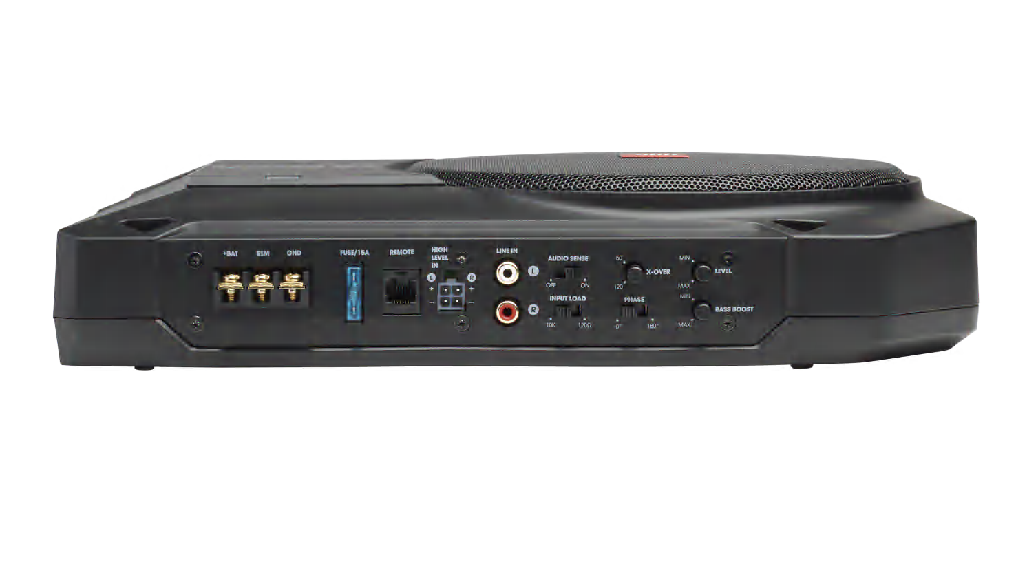 - Aktiivisubwoofer, jossa on sisäänrakennettu vahvistin, jonka teho on 125 wattia RMS.