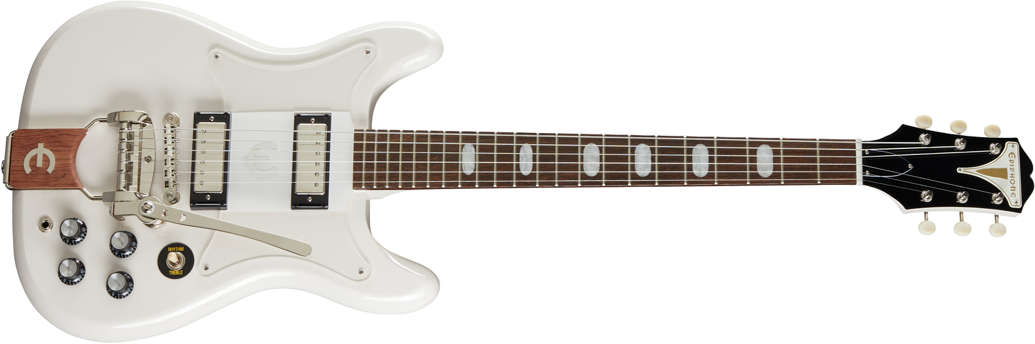 Epiphonen ensimmäinen massiivirunkoinen sähkökitara, Crestwood Custom Tremotone - tässä upealla Polaris white -viimeistelyllä. Crestwood on historiallinen kitara, joka debytoi vuonna 1958 ja tuli sitten tunnetuksi nimellä Crestwood Custom. Kitarassa on tupla-cutaway mahonkirunko ja keskikokoinen C-profiilinen kaula - myös mahonkia. Lisäksi kitarassa on kaksi Epiphone PRO mini humbucker pickupia, jotka antavat kitaralle upean resonanssin korkeilla taajuuksilla. Kitarassa on laakeri-sormilauta, ja siinä on upea pyöreä soundi ja uskomaton soitettavuus.