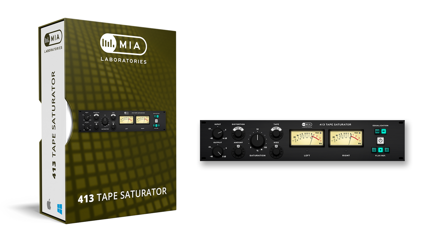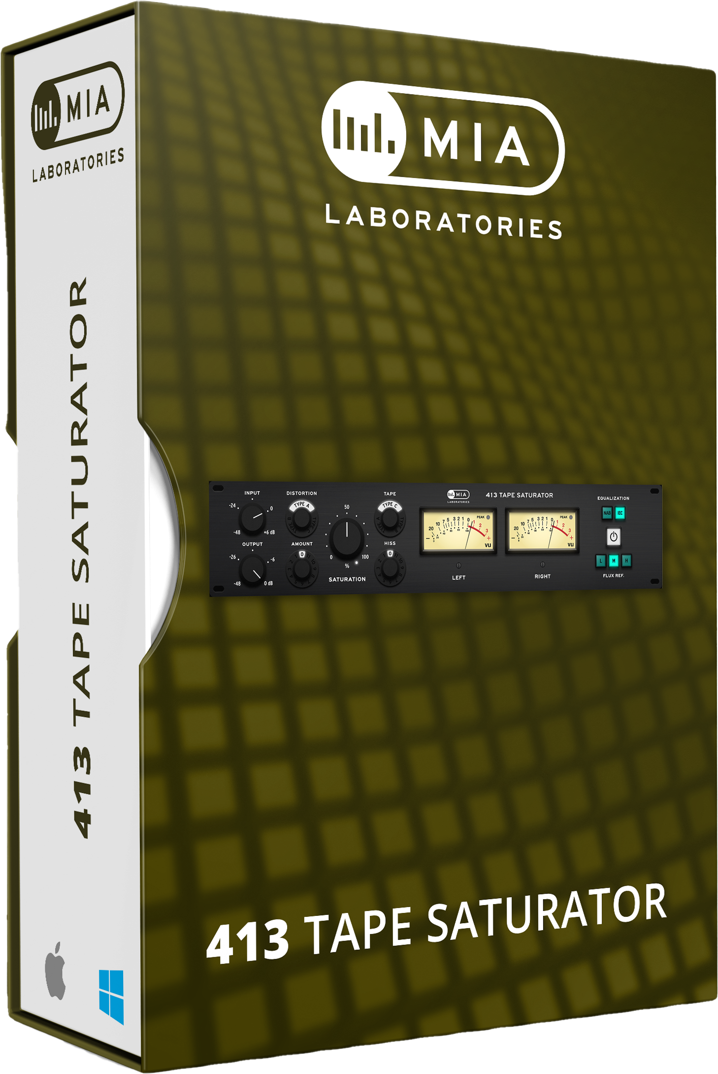 The 413 Tape Saturator reproduces the non-linear characteristics of an analog tape in "over-drive". It plays with magnetic saturation : a phenomenon that occurs when you increase the amplitude of the 'recorded' signal. This plug-in offers 3 different types of Analog Tape, as well as 3 different types of distortion.