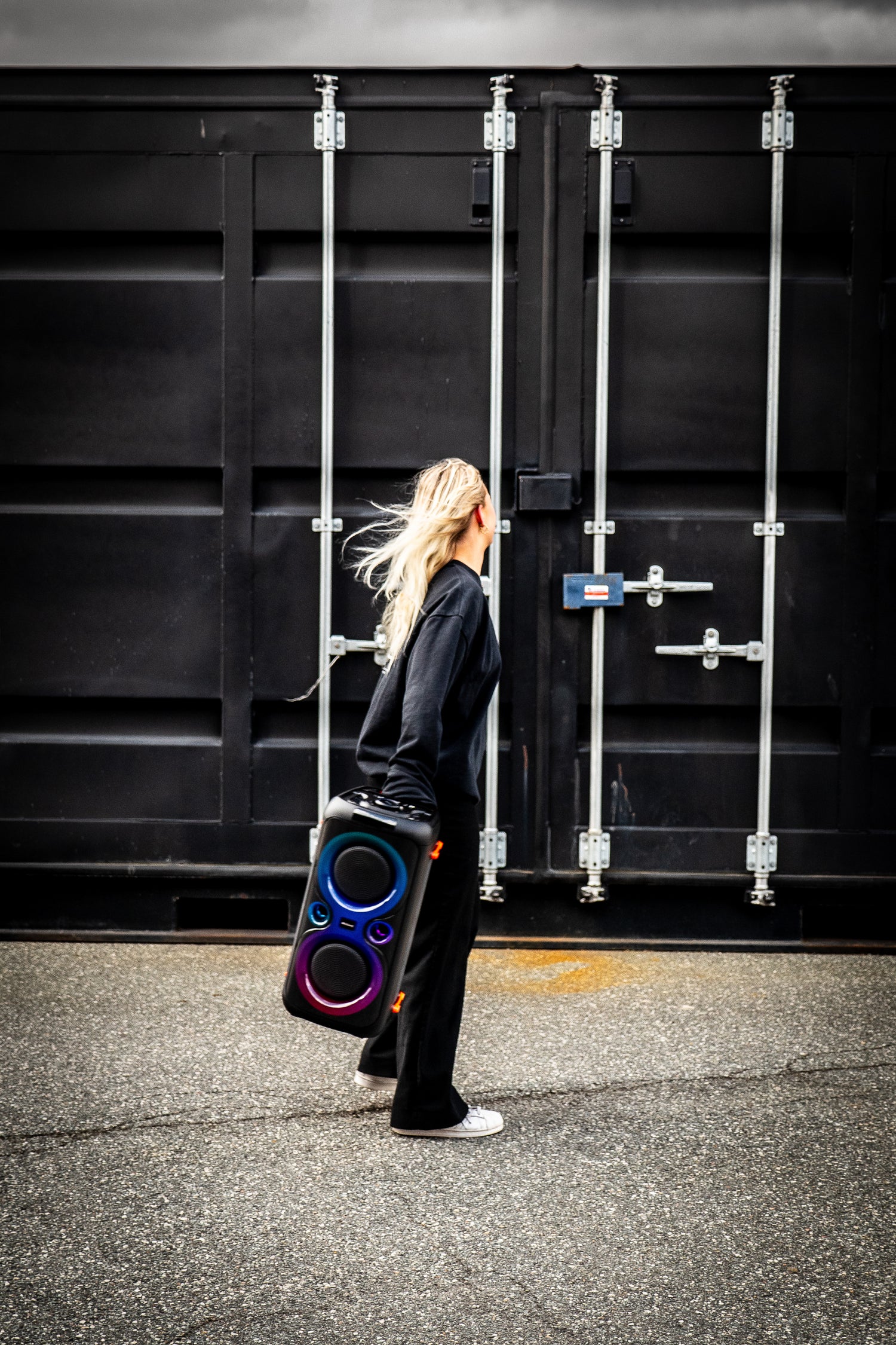 - Siisti ja kompakti juhlakaiutin, jossa on bluetooth, valoshow ja mikrofonitulo