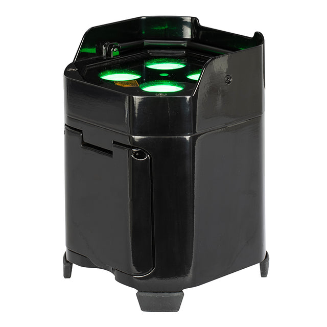 - Langaton paristokäyttöinen DMX-ohjattu valaisin, jossa on 4 x 20 watin RGBAW+UV LEDiä.