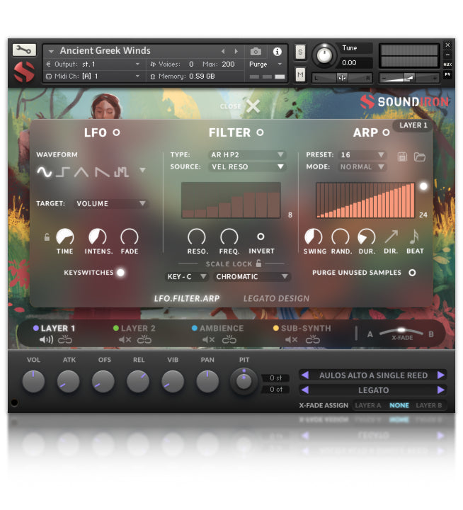 Jokainen soitin on äänitetty tarkasti tuottaja John Valasin toimesta, pyöreän robinin vaihteluilla ja useilla dynamiikoilla ja äänityksillä. Nautit joustavista GUI-ominaisuuksistamme ja laajasta valikoimasta kromattisia ja erikoisefektiartikulaatioita. Käyttöliittymä tarjoaa täydelliset esityskontrollit, mukaan lukien todellisen legaton vasteen hallinta, simuloitu portamento-bend, arpeggiaattori, joustava askel-sekvensoitava suodatin ja LFO-järjestelmät sekä modulaarinen DSP FX -hylly, jolla voit muokata ääntäsi haluamallasi tavalla. Olemme myös luoneet 20 ainutlaatuista ääni-suunniteltua ympäristöä suoraan raakoista akustisista lähdeäänityksistä, jotta saat lisää tekstuuria ja vielä enemmän luovaa potentiaalia. Ancient Greek Winds sisältää 3,517 24-bittistä 48kHz stereo-näytettä ja sen koko on hieman yli 4 GB.