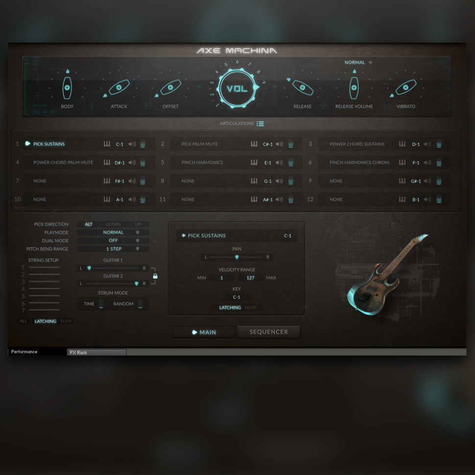 Olemme pakannut käyttöliittymän tehokkailla äänenmuokkaus- ja esitysohjaimilla antaaksemme sinulle täydellisen joustavuuden yhdistettynä soitettavuuteen. Pääasetukset sisältävät jokaisen näytteen kirjastosta ja joukon voimakkaita esitysominaisuuksia. Lite-asetuksissa on vähemmän round-robins -vaihtoehtoja tilanteisiin, joissa RAM-käytön vähäisyys on tärkeää. DI-asetukset sisältävät puhtaan kitarasävyn, joka on nauhoitettu suoraan ilman esivahvistinta tai muuta äänenväriä tuottavaa laitteistoa, antaen sinulle puhtaan kitarasävyn, joka on valmis reampattavaksi sisäänrakennetuilla efekteillä tai muulla valitsemallasi tavalla. Amped-asetukset sisältävät Craig Petersin huolellisesti säädetyn räätälöidyn sävyn, joka antaa sinulle modernin hi-gain -sävy suoraan laatikosta. Standardiasetuksissa sinulla on pääsy yksittäisiin kieliin, mikä antaa sinulle täydellisen hallinnan kunkin kielen saatavilla olevaan alueeseen, mukaan lukien päällekkäiset nuotit. Yksinkertaiset variantit asetuksesta jättävät tämän vaihtoehdon pois ja sisältävät standardin ylityspisteen jokaiselle kielelle, kun se nousee asteikolla.