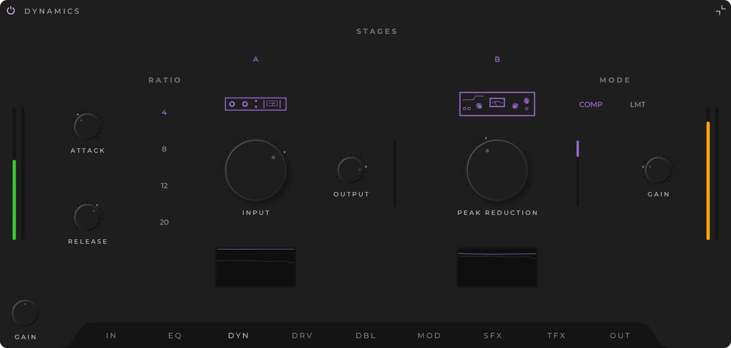 Kaksinkertaiset kompressioyksiköt, jotka on mallinnettu erilaisten analogisten filosofioiden mukaan: nopea, huippuherkkä FET-tyyli transienttien hallintaan, ja ohjelmasta riippuva optinen tyyli tasaiselle tason säädölle. Konfiguroitava reititys sarjassa tai rinnakkain.