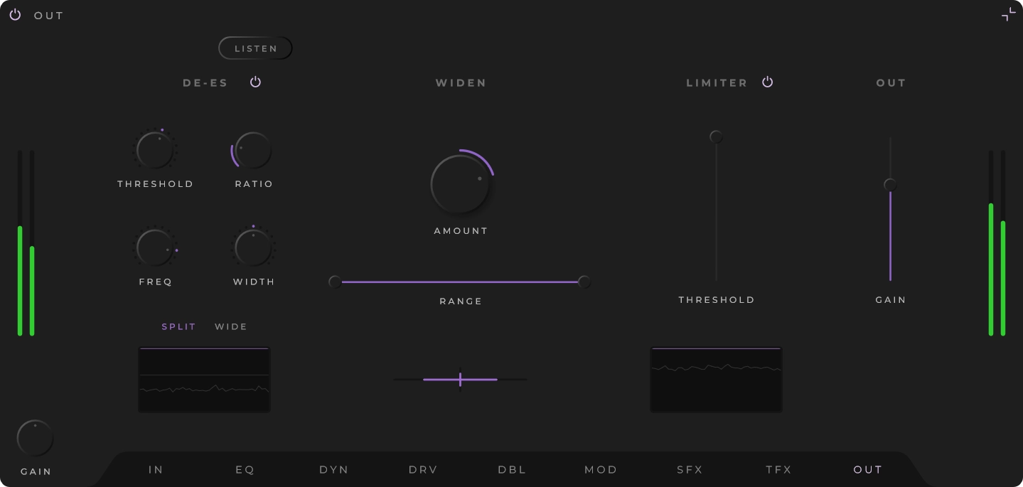 Viimeistelykäsittelyyn kuuluu brickwall-limiteri, stereolevittäjä ja ulostulon de-esser.