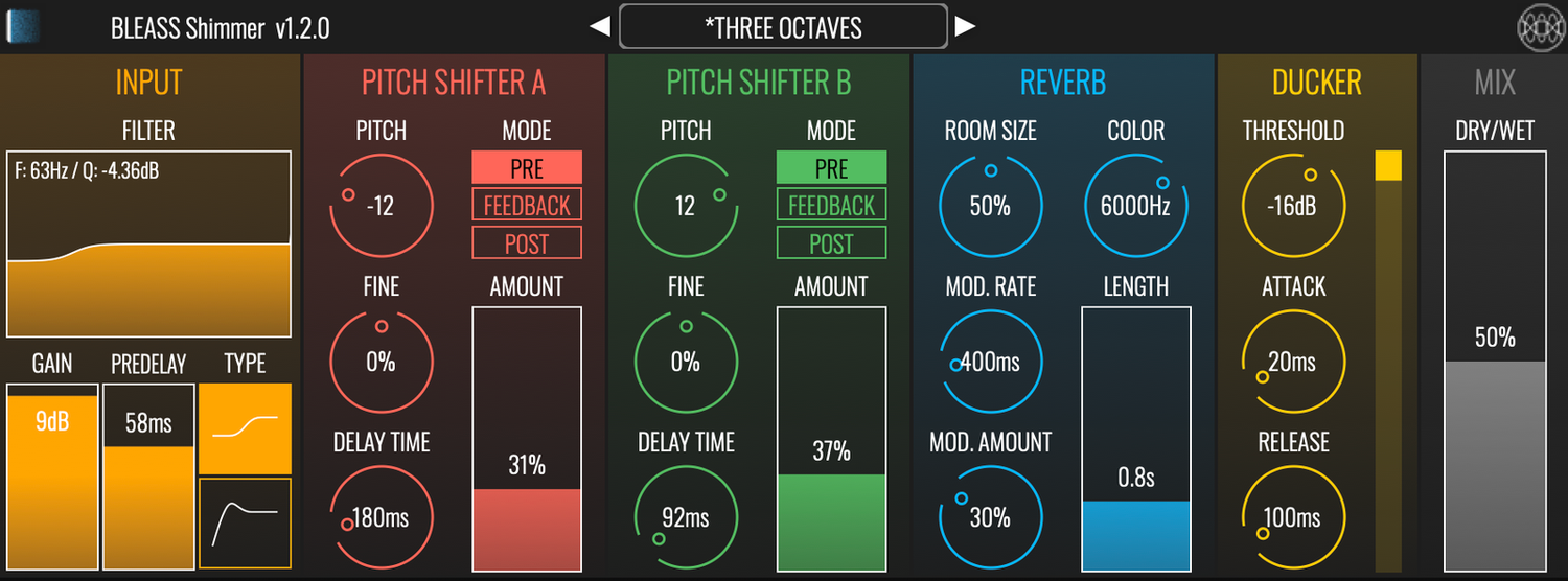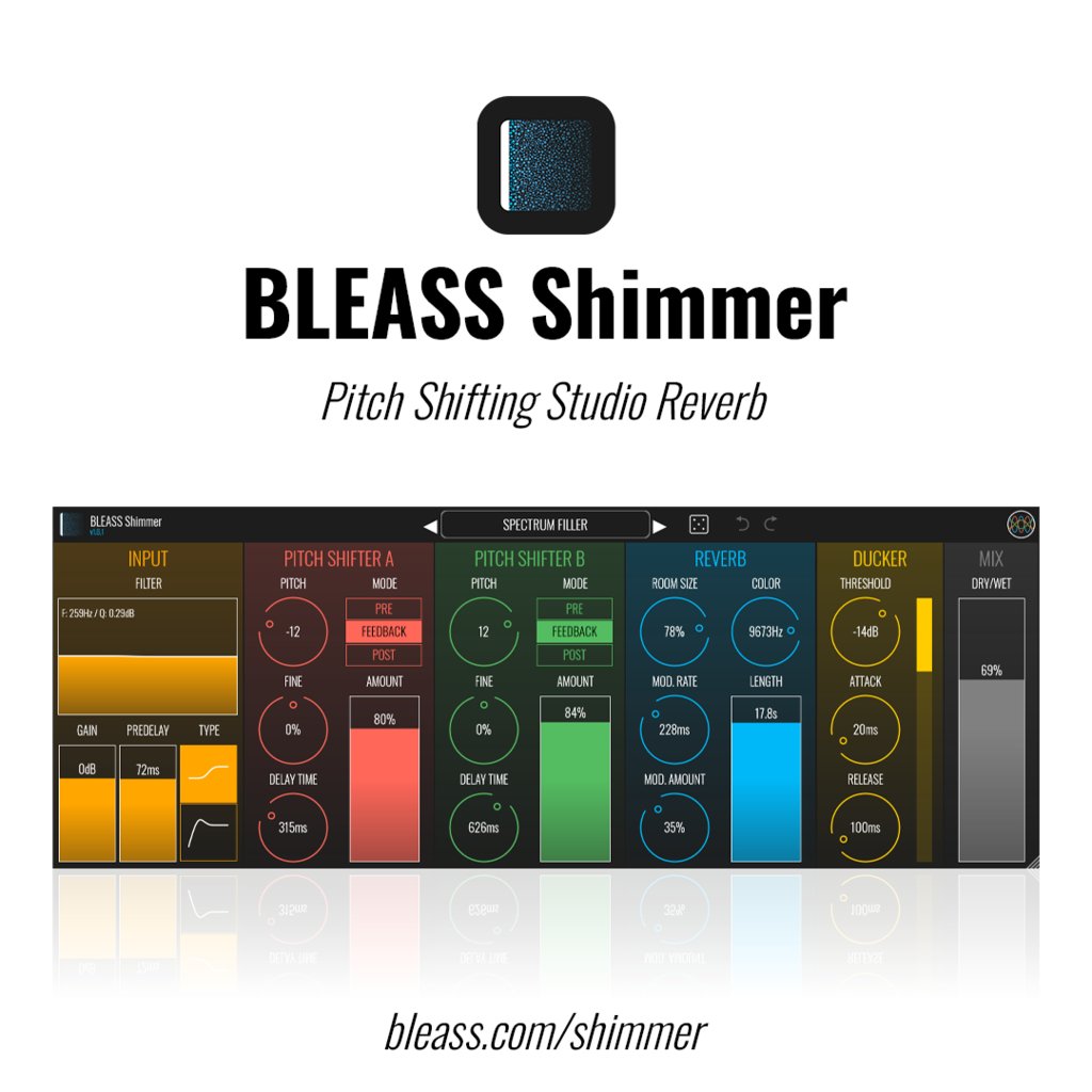 BLEASS Shimmerin käsittelyvaiheet tekevät siitä erittäin monipuolisen pluginin, joka pursuaa luovia musiikillisia mahdollisuuksia: Saapuva ääni voidaan muokata monimuotoisella sisääntulo-suodattimella; kaksi pitch shift -moduulia voidaan sijoittaa eri kohtiin signaaliketjussa hyvin erilaisilla tuloksilla; kaiku on puhdas ja runsas; ja integroitu ducker auttaa suoraa signaalia erottumaan kaikuista, ja se on täydellinen rytmisiin ja "blooming" -efekteihin.