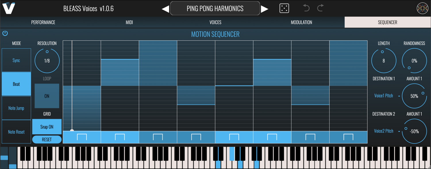 Neljä ääntä voidaan siirtää itsenäisesti ±1 oktaavin verran tai tasoittaa valittuun sävelkorkeuteen, kun taas kahdeksan ääntä laukaistaan MIDI:llä, mikä vastaa saapuvia nuotteja. Syvä MPE-tuki mahdollistaa ilmaisutaitoiset vokaliosat ja soolot realistisilla liu'illa ja trillillä. Synteettiset modulaattorit, mukaan lukien kaksi LFO:ta, ympäristön seuraaja ja kaaviosäätö, lisäävät dynaamista vaihtelua.