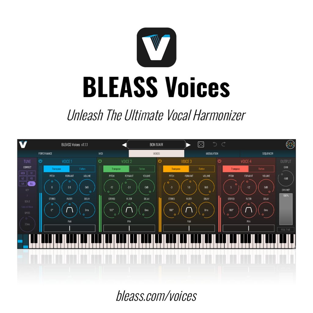 BLEASS Voices on monipuolinen audio plugin, joka mahdollistaa vokalien ja monofonisten lähteiden sävelkorkeuden muuttamisen, muuntamisen, tuplaamisen ja harmonisoinnin. 12 sävelkorkeuden muuttamaa ääntä tarjoavat hallintaa sävelkorkeuteen, formaattiin, sävyyn, leveyteen ja sijoitteluun, mikä määrittelee vokaliluovuuden uudelleen.