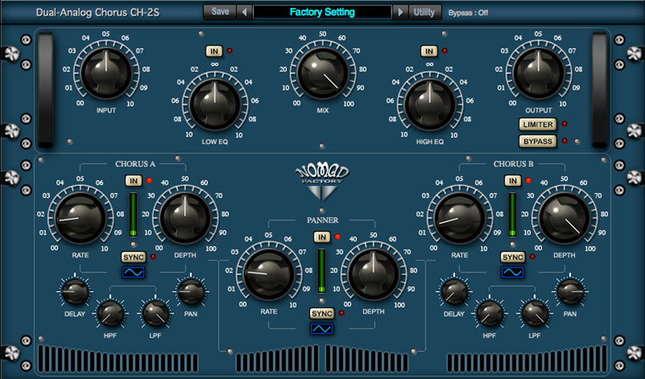 The BT Dual-Analog Chorus CH2S creates various types of classic modulation effects, such as Leslie, Chorus, and Auto-pan. In addition, this effect provides the ultimate in control over LFO's and panning, including waveform selection. Whether you need subtle enhancement or aggressive effects on a track, the CH2S has the power you need.