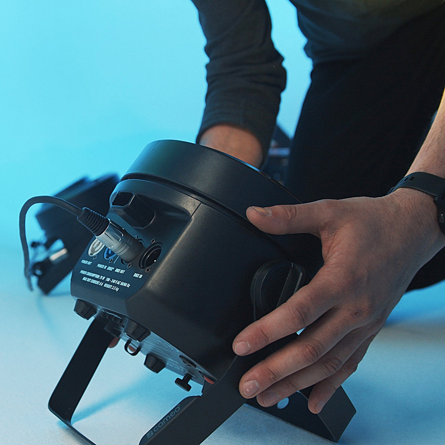 ROOT® PAR BATTERY leveres med et dobbelt monteringsbeslag og en skrue til vippetilpasning, så RGBW PAR-spotlighten også kan bruges som uplight uden beslag. Ud over det robuste og kompakte kabinet og PowerCON®-kompatible ind- og udgange sikrer passiv, blæserfri konvektionskøling maksimal driftssikkerhed på farten.