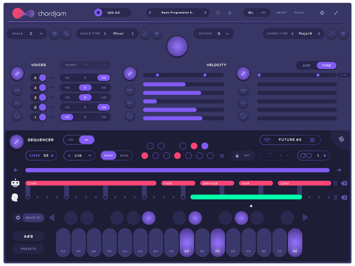 Chordjam is an innovative plug-in and standalone application that builds chords and progression patterns through intuitive user-guided randomisation.
