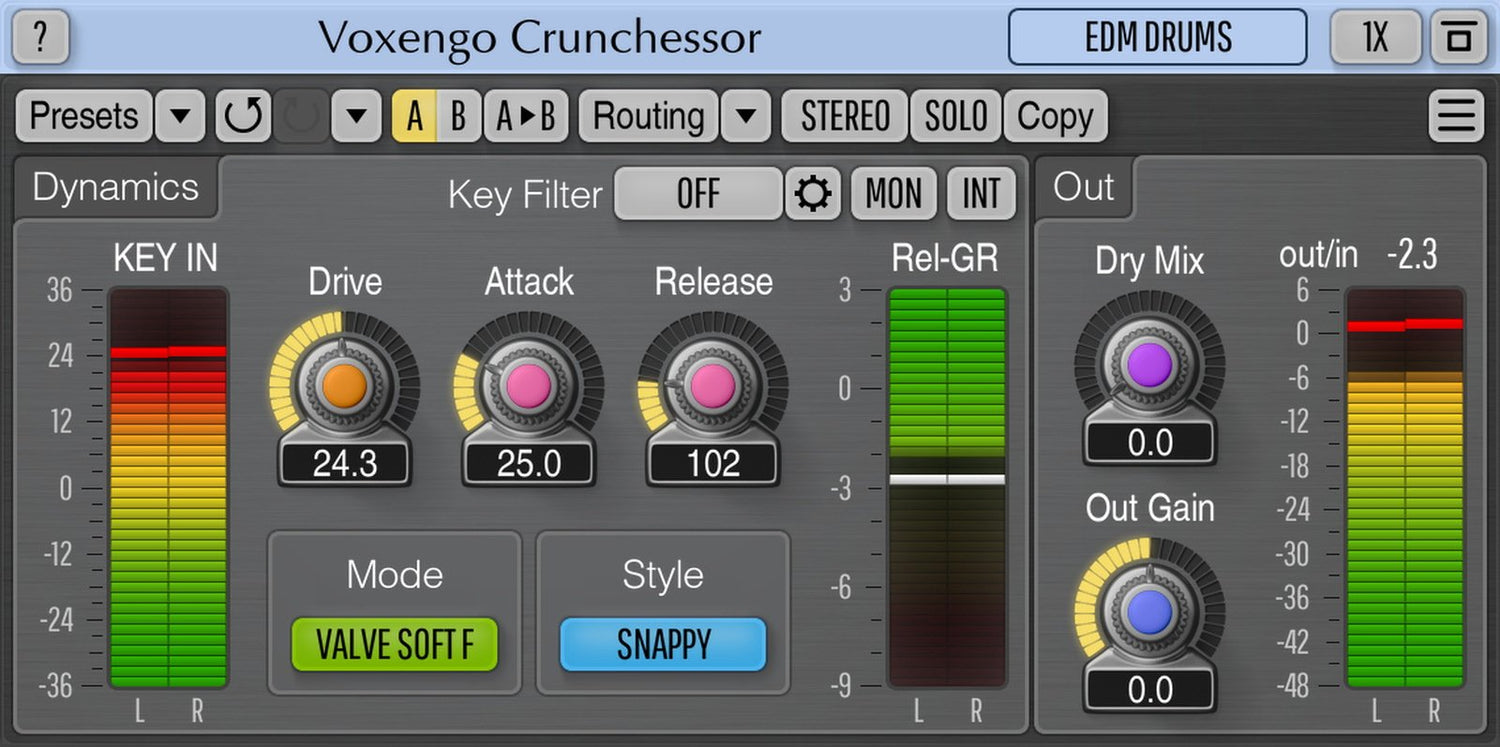 Beside this, Crunchessor offers you a selection of compression coloration styles--by itself a pretty unique feature for a compressor. By choosing an appropriate coloration style, you can add the character most suitable for the sound material you are working with. As an option, you can disable both coloration and valve warming processing to get a neutral and clean compression sound.