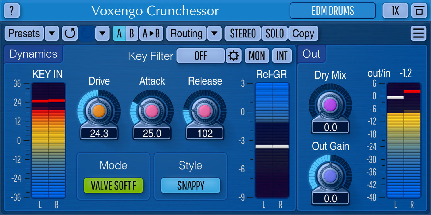 Lisäksi Crunchessor tarjoaa valikoiman kompression “coloring”-tyylejä – itsessään varsin ainutlaatuinen ominaisuus compressorille. Valitsemalla sopivan coloring-tyylin voit lisätä juuri kyseiselle äänimateriaalille parhaiten sopivaa luonnetta. Halutessasi voit poistaa käytöstä sekä coloringin että putkilämmitysprosessoinnin, jolloin saat neutraalin ja puhtaan kompressiosoundin.