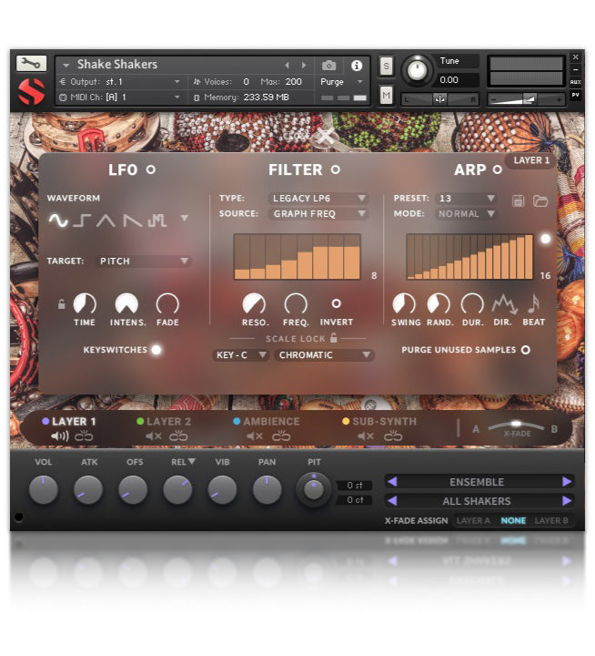 Shake sisältää kaiken, mitä tarvitset seuraavaan sävellykseesi, mukaan lukien pieniä pehmeitä muovisia ja raakoja nahka-egg shakersia, täytetty pingispallo rattlesia, raakoja nahkoja, muovi- ja puumarakkoja, pieniä ja keskikokoisia instrumentteja, jotka on valmistettu luonnonmateriaaleista, kuten ruoko, siemenkodat, kurpitsat, köynnökset, rottinki, kookospähkinät, pähkinäkuoret, bambu, puu ja metalli. Mukana on myös monia ainutlaatuisia instrumentteja, jotka David on tehnyt tai improvisoinut, kuten bambu sateenvarjoshakeri, mungopapu shakeri, cocktail-tikku shakeri ja pad box multi effect shaker (litteä puulaatikko, joka sisältää kuulalaakereita) sekä useita Caxixi-yhdistelmiä. Intuitiivisen monikerroksisen modulaarisen käyttöliittymämme avulla voit nauttia täydestä vapaudesta sekoittaa, kerrostaa, vaikuttaa ja mukauttaa jokaista ääntä sydämesi kyllyydestä.