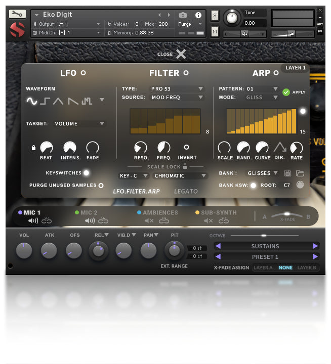 Olemme pakannut käyttöliittymän täynnä hienoja äänenmuokkausohjaimia, jotka antavat sinulle joustavuutta muokata ääntä monin eri tavoin. Sinulla on hallinta äänenvoimakkuuteen, hyökkäykseen, vapautumiseen, transienttikorjaukseen, vibratoon ja oktaavikerroksiin. "Glide"-ohjaussäädin mahdollistaa legato- ja portamento-soitot. Löydät myös mukautettavan LFO-järjestelmän, jossa on valittava LFO-muoto, modulaatiotavoiteparametri, nopeus, intensiivisyys, tempo-synkronointi ja fade-in-aika. Voit myös soveltaa valintaasi 13 matala- ja ylipäästösuodatinta sekä FX-suodatinta, joissa on määritettävät modulaatio-ohjausvaihtoehdot, mukaan lukien nopeus, modulaatiopyörä, ilmaiseminen, jälkikontakti, näppäinasema ja askel-sekvensseritaulukontrolli. Voit myös käyttää mukautettavaa arpeggiaattoria, jossa on sisäänrakennettu nopeussequenceritaulukko ja hallinta arp-suuntaan, nuottiaikaan, swingiin, satunnaistamiseen ja kestoon.