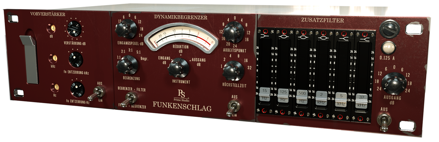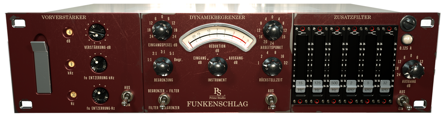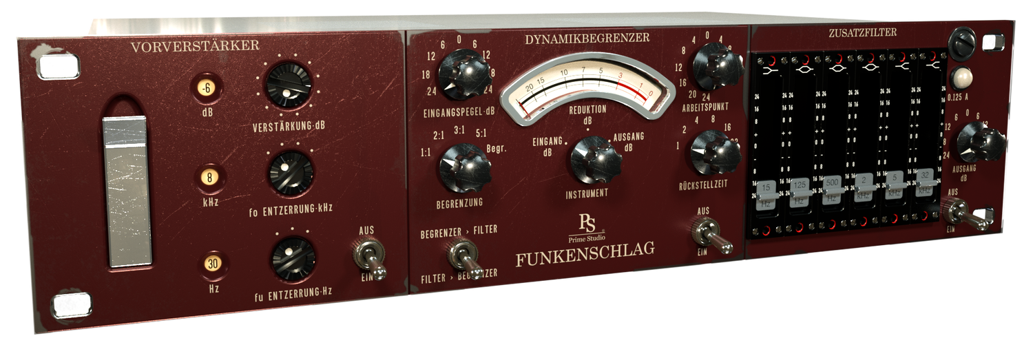 Toinen osa on kompressori ja rajoitin, joka perustuu 1960-luvun analogiseen vintage-laitteeseen. Klassisten säätimien, kuten „Eingangspegel“, „Begrenzung“, „Arbeitspunkt“ ja „Rückstellzeit“, avulla sinulla on sävyalue hienovaraisesta kompressiosta signaalin voimakkaaseen rajoittamiseen.