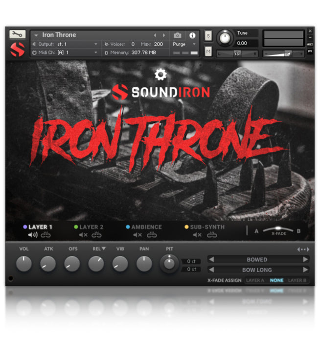 Käytimme viulunjousia valtaistuimen reunoilla luodaksemme outoja melodisia ja epäsovinnaisia sävyjä. Mukana on useita erilaisia jousisoittimien settejä, mukaan lukien pitkät kestävyydet, keskikokoiset liukuefektit, lyhyet staccato-, spiccato- ja tremolo-kestot. Tutkittavaksi on tarjolla useita erilaisia mailarapsutuksia, harja-, sormi- ja kampaeffektejä. Sormivedot, kumipallo ja litteät mailarapsutukset luotiin vetämällä mailojen (tai sormien) reunaa valtaistuimen pintoja pitkin, pitkissä kaarissa ja viivoissa. Tämä sai sen resonoiimaan samankaltaisesti kuin raaputettu gongi. Mailaiskulykset tuotettiin puu-, huopa- ja metallikärjillä varustetuilla mailoilla ja kapuloilla, jotta saatiin aikaan tavanomaisia metallirumpusettiä. Iron Throne 2.0:lle loimme täysin uusia ympäristöjä, droneja ja ilmavia pad-ääniä raakamateriaalin nauhoituksista. Tämä kirjasto sisältää myös 20 uutta räätälöityä FX-esiasetusta, jotka antavat sinulle välitöntä inspiraatiota seuraavaan elokuvaasi/videopeliisi, ääniraitaan tai musiikkikoosteesi.