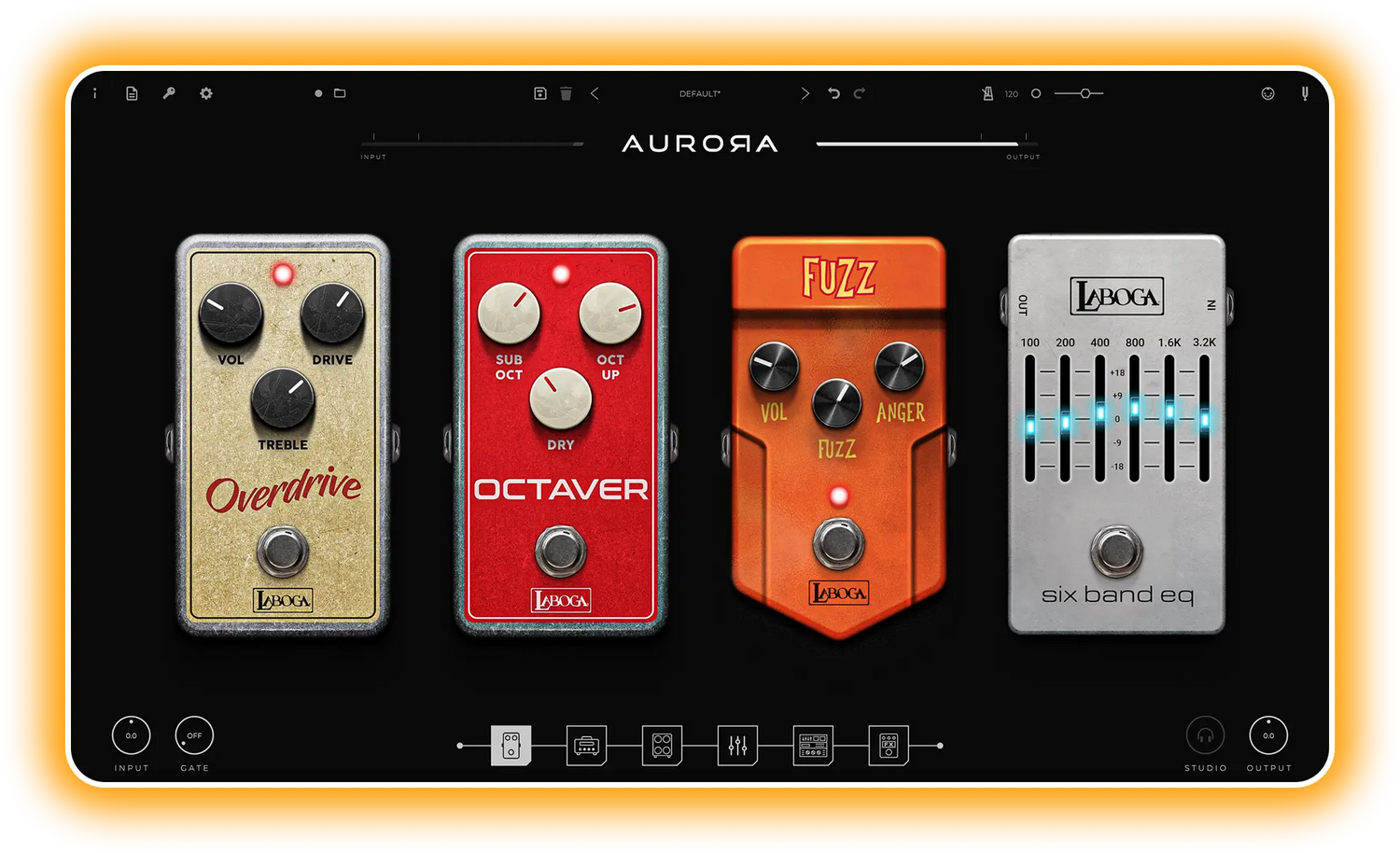 - Pedal (Stomp) Section Includes four pedals with reorderable signal flow: Flavored Overdrive Octaver (up/down modes) Mighty Fuzz 6-Band Input EQ