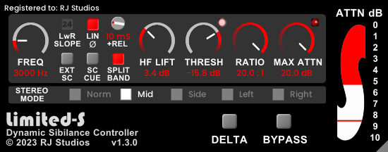 Limited-S on korkealaatuinen De-Esser, Enhancer ja karheuden säätölaite, joka on suunniteltu käytettäväksi sekä miksauksessa että masteroinnissa. Limited-S käyttää erilaista lähestymistapaa kuin tyypilliset De-Essers, Dynamic EQ:t jne. Limited-S ei käytä perinteistä, ja usein "lörpöttelevää", kompressori-tyyppistä Attack/Decay-tasotunnistinta. Sen sijaan Limited-S käyttää äärellistä impulssivastausta (FIR) -suodatinta, joka laskee tarkasti signaalin vaipan koko ajan. Hyväksyttävien tulosten saamiseksi ei tarvitse vaivata päätään hyökkäys- ja hajoamisasetusten kanssa. Kun Kynnysarvo ja Suhde on asetettu oikein, de-essing-toiminta on useimmissa tapauksissa täysin läpinäkyvää. Kaikki mitä kuulet, on vähemmän sibilanssia.