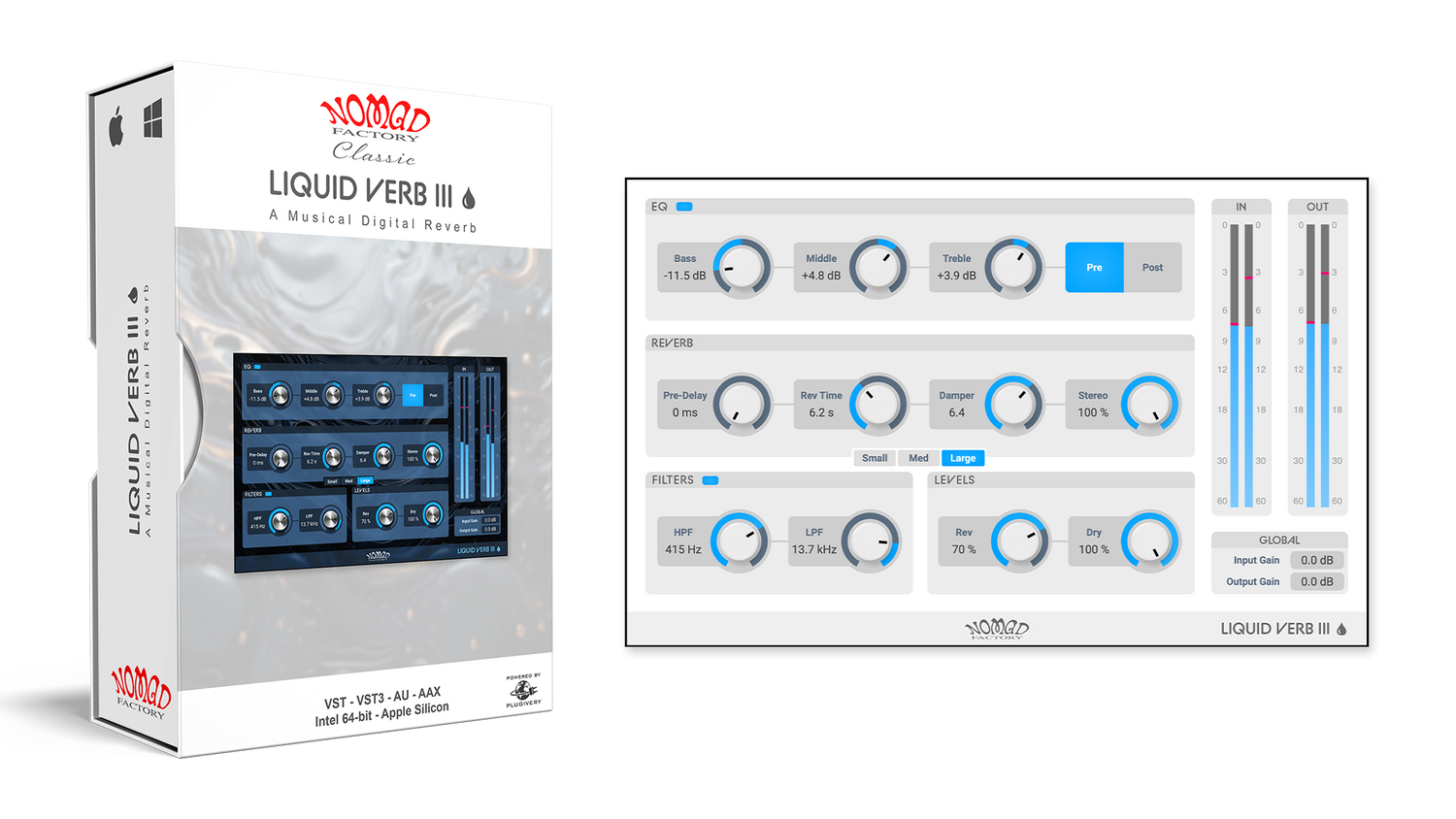 Vælg mellem Room, Hall og Plate algoritmer for at tilpasse reverb-karakteren til dit mix. Finjuster responsen med Pre-Delay, Decay og Damping kontroller, og form tone yderligere ved hjælp af integrerede high-pass og low-pass filtre.