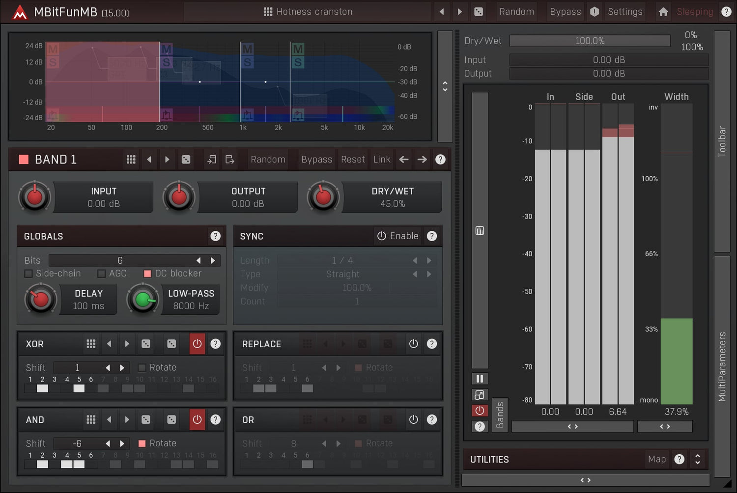 MBitFunMB is a serious tool for extreme distortion lovers. It converts the incoming audio into limited fixed-point precision data of 1-16 bits per sample and lets you access each bit with several bit-manipulation operations and finishes the processing with a low-pass filter. All with up to 6 independent frequency bands, 4 modulators...