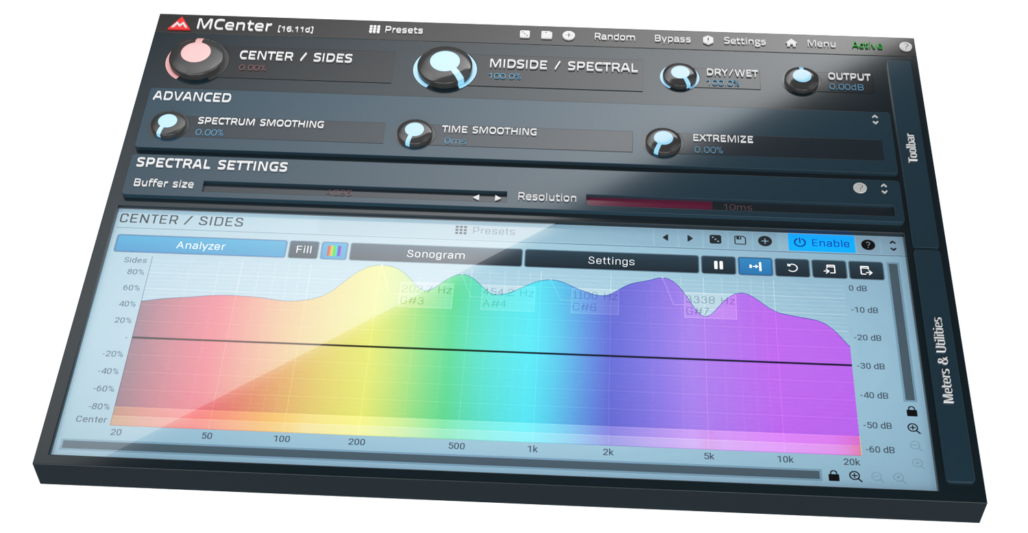 MCenter lets you take charge of the elusive "phantom center" in your stereo signal. MCenter employs a complex spectral algorithm, which separates what really sounds stereo and really sounds mono, which is not true for mid/side processing - for example, just a hard panned track is 50% mid and 50% side from mid/side processing perspective, despite it naturally sounds stereophonic. MCenter is here not only for mastering but for every occasion where true mid/side balance is needed. For mixing reason or creative use.