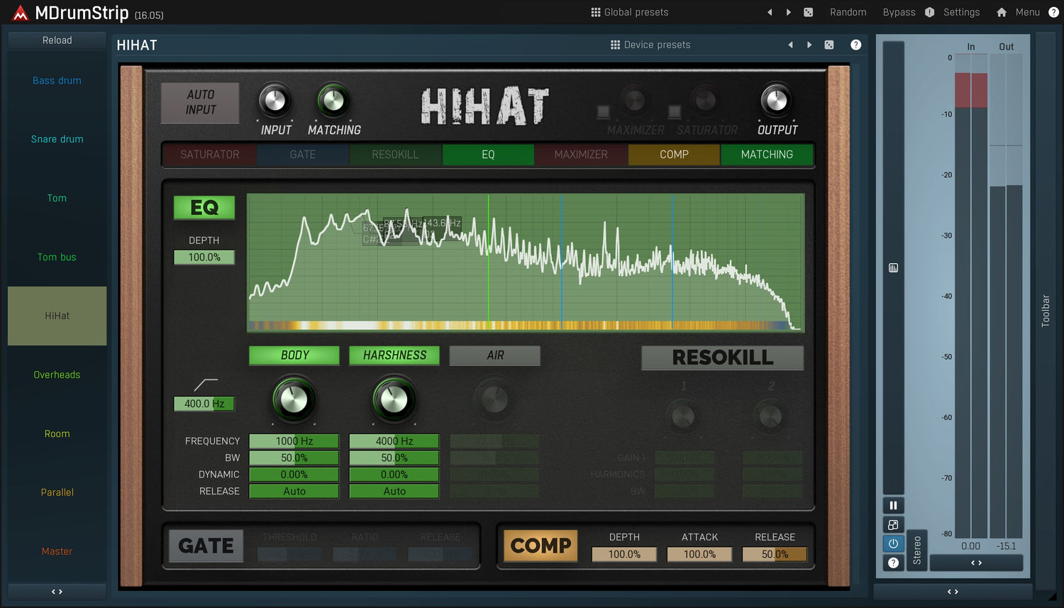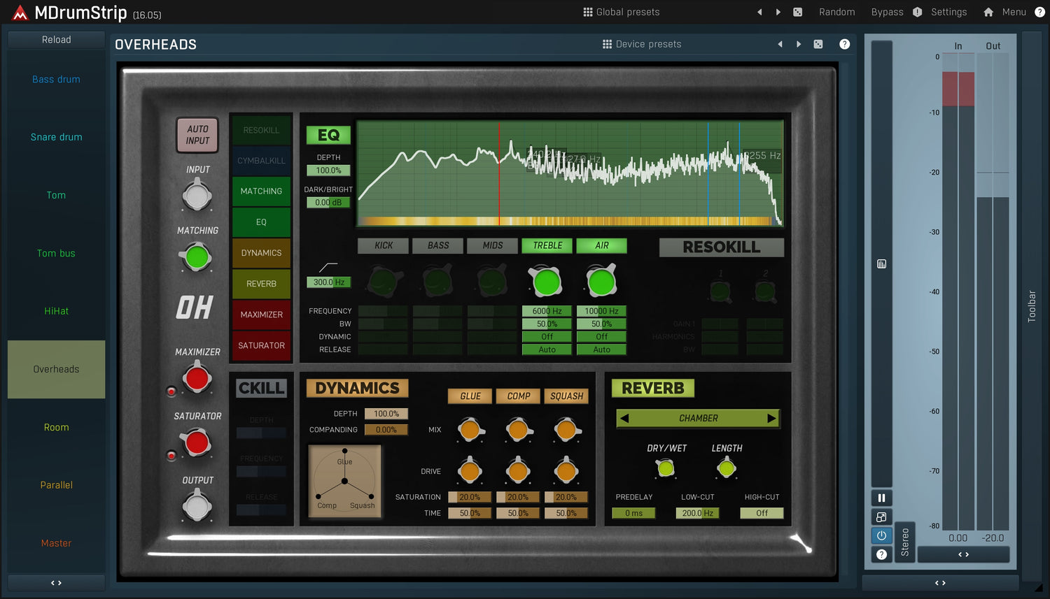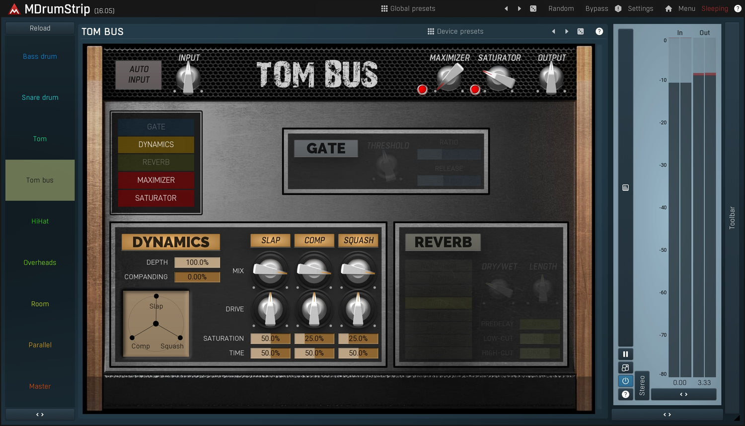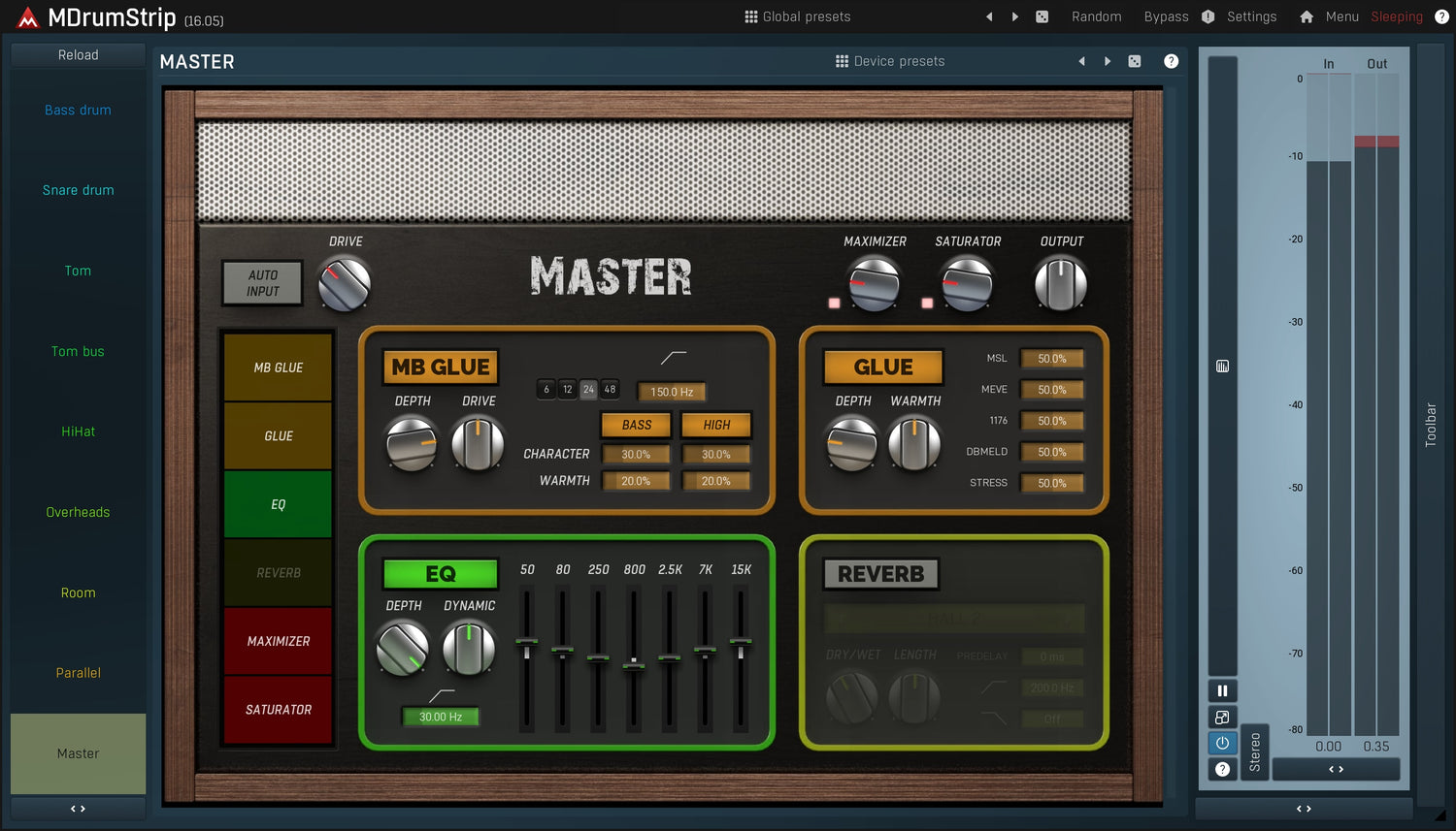 MDrumStrip has been designed for one specific task and contains everything it needs to do. No need for several compression and EQ plugins reverbs etc. Just follow the instructions and do the mixing. Usually, only minimal tweaks are needed since it smartly analyses your audio and customises the internal algorithms for it. It's quick and easy. But MDrumStrip also contains lots of more advanced controls, just in case you want to go in-depth. With zero latency, you can even take MDrumStrip out and use it live.
