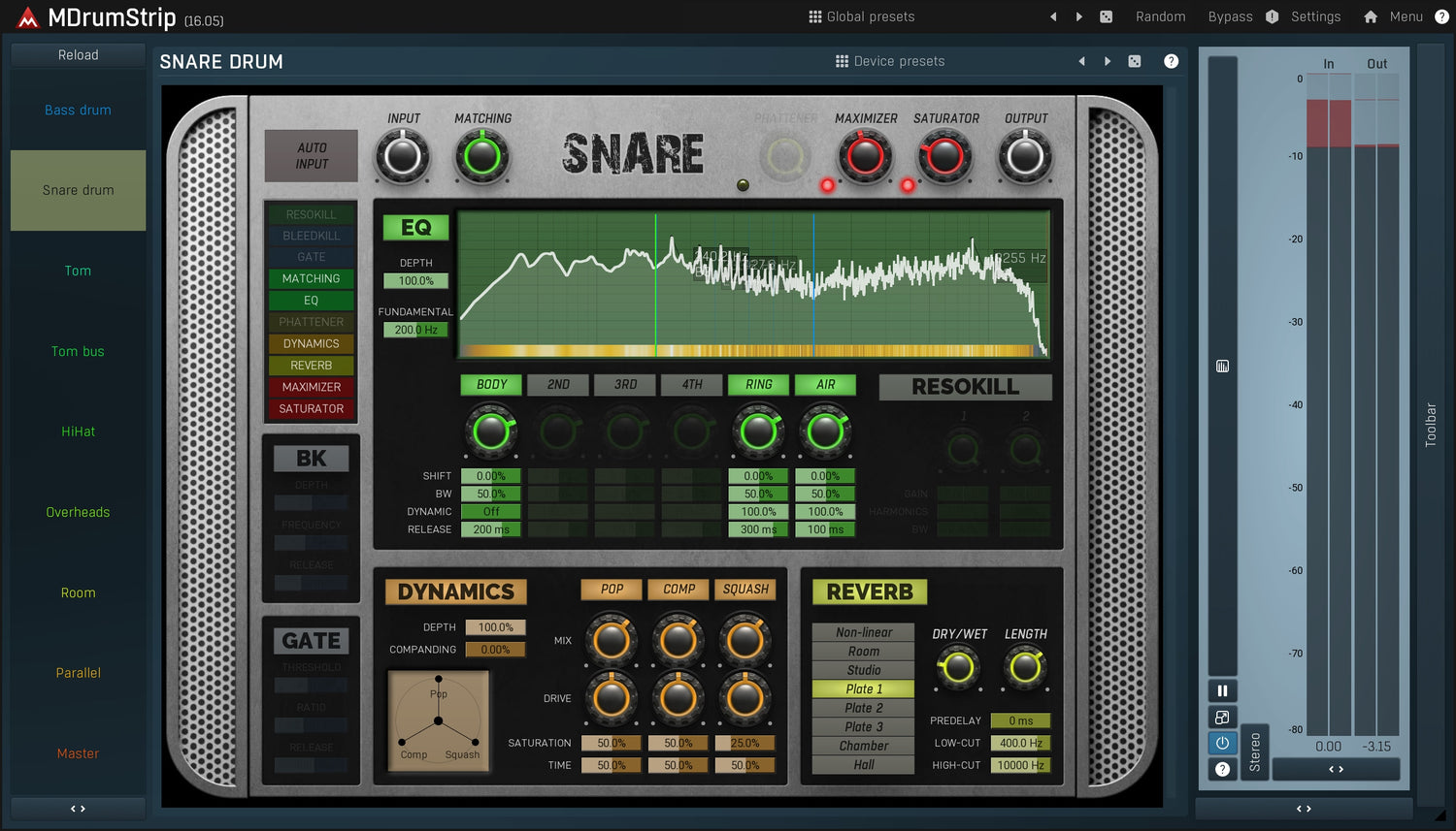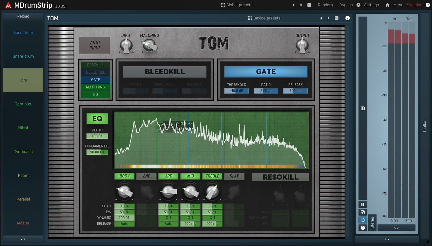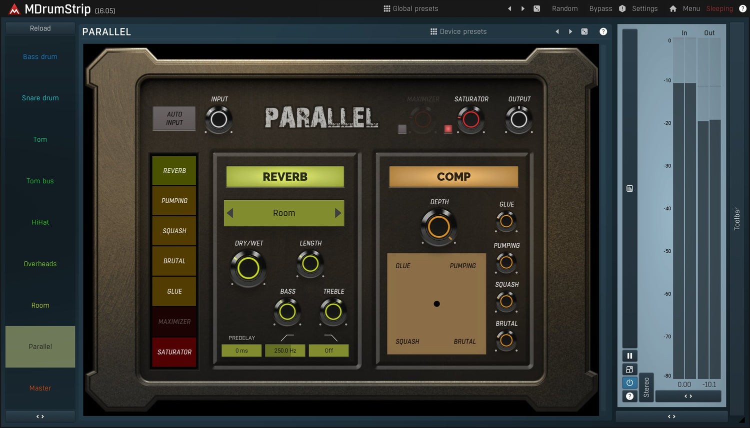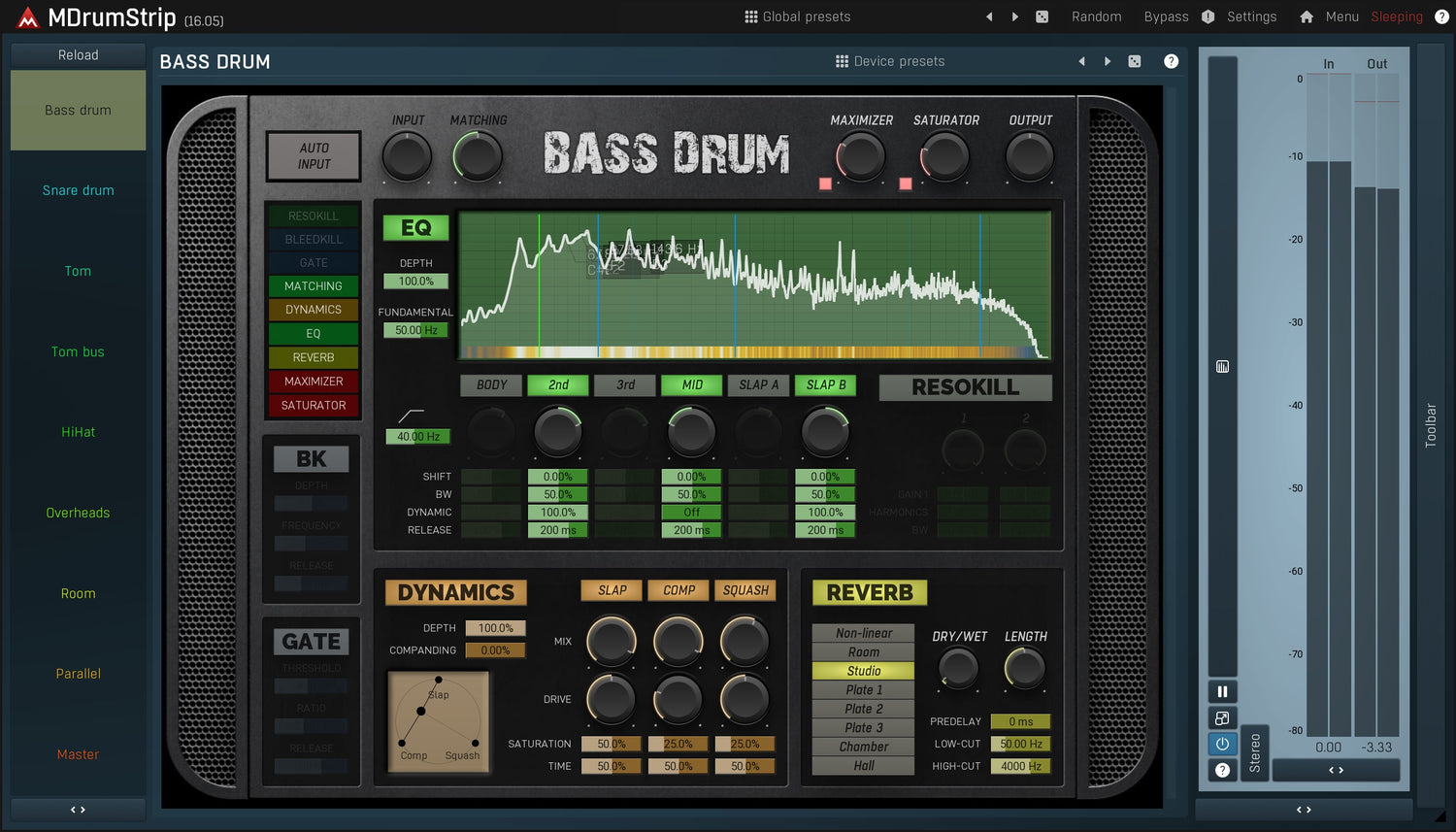 MDrumStrip has been designed for one specific task and contains everything it needs to do. No need for several compression and EQ plugins reverbs etc. Just follow the instructions and do the mixing. Usually, only minimal tweaks are needed since it smartly analyses your audio and customises the internal algorithms for it. It's quick and easy. But MDrumStrip also contains lots of more advanced controls, just in case you want to go in-depth. With zero latency, you can even take MDrumStrip out and use it live.