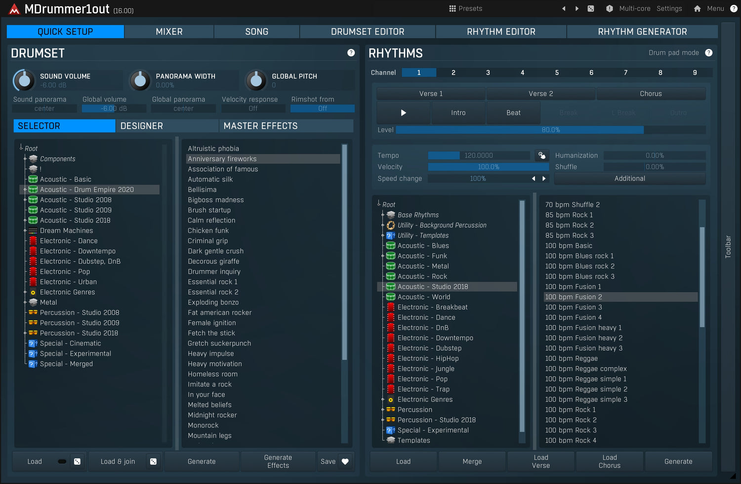 MDrummer voi luoda loputtoman määrän uusia rumpukokoelmia yhdellä napin painalluksella, analysoida ja tuoda näytekirjastoja, yhdistää useita rumpukokoelmia ja paljon muuta. MDrummer on täydellinen, olitpa etsimässä perinteistä tyyliä, todella ainutlaatuista ääntä muutamalla klikkauksella, tai jos olet valmis menemään syvälle ja tutkimaan maailman edistyneimmän rumpukoneen syvyyksiä.