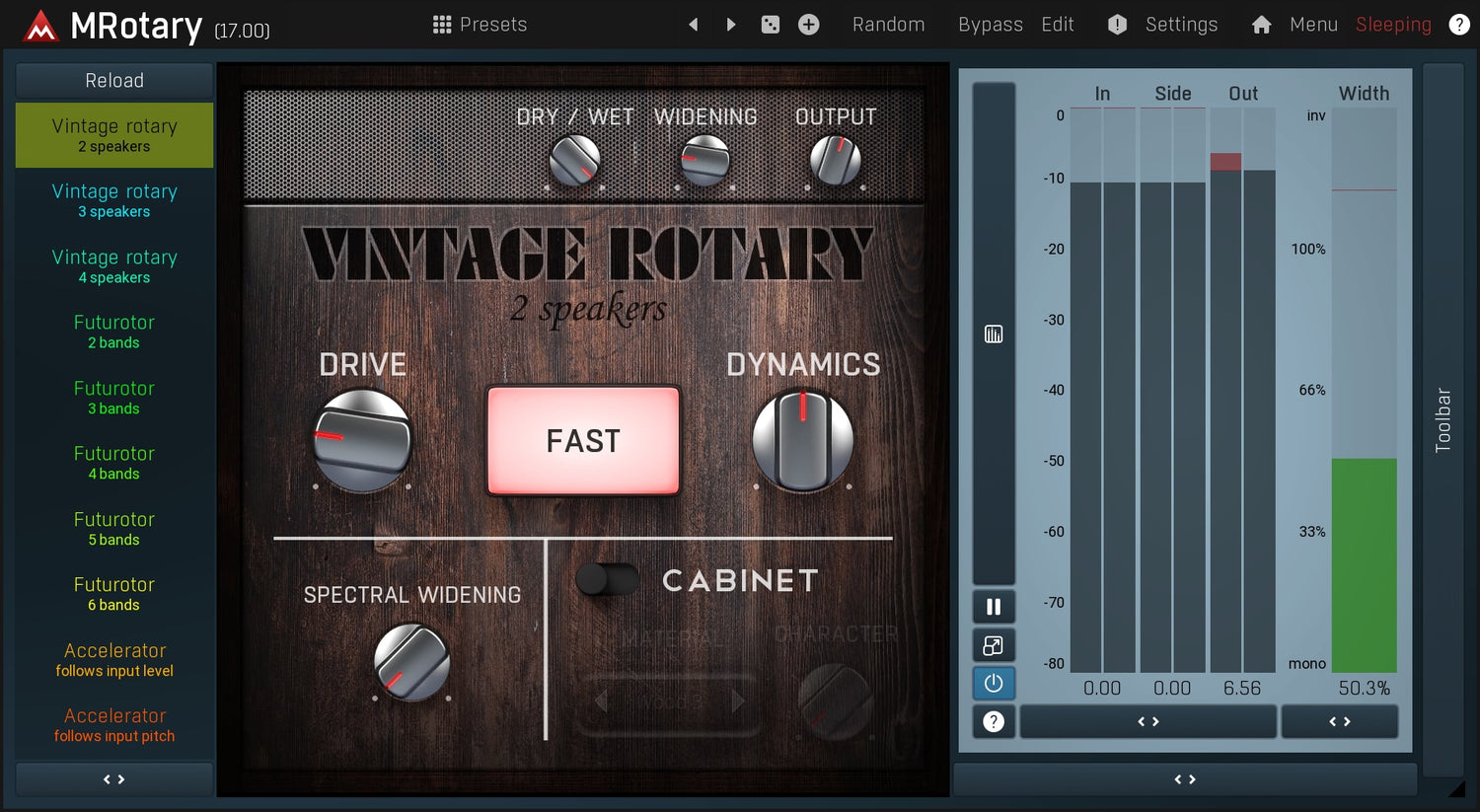 MRotary on lopullinen pyörösimulaattori, joka voi tarjota paitsi upeaa vintage-ääntä, myös futuristista algoritmista ääntä, jossa voi olla jopa 6 kaiutinta samanaikaisesti. Voit suunnitella oman kaappisi käyttäen mitä tahansa materiaalia puusta lasiin, käsitellä pyörösignaalia täysin varustetulla dynaamisella equalizerilla ja paljon muuta.