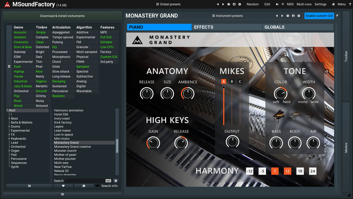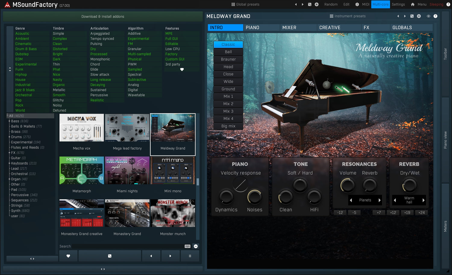 MSoundFactory saattaa olla markkinoiden voimakkain instrumentti. Se on modulaarinen, joten voit käyttää niin monta oskillaattoria, suodattimia, näytteitä jne. kuin haluat. Siinä on äänen mukaan ja globaali modulaatio, täysi MPE-tuki, markkinoiden parhaat äänenlaadut oskillaattorit, täysin modulaarinen efektimoottori... Ja me vasta aloitamme...