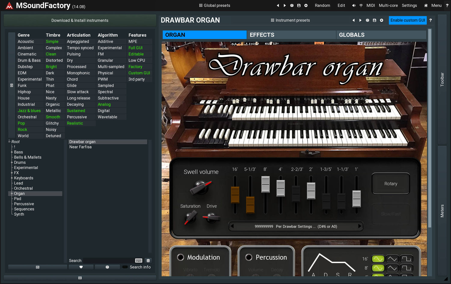 MSoundFactory tarjoaa satoja ennalta määriteltyjä ääniä, jotka ovat saatavilla globaalien esiasetusten kautta, aivan kuten muutkin instrumentit. Todellinen ihme on kuitenkin kategorisoitu instrumenttijärjestelmä. Instrumentti ei ole vain ääni, mahdollisesti muutamalla makro-ohjaimella. Se on kokonainen "instrumentti", jossa on paljon asetuksia ja omia esiasetuksia.
