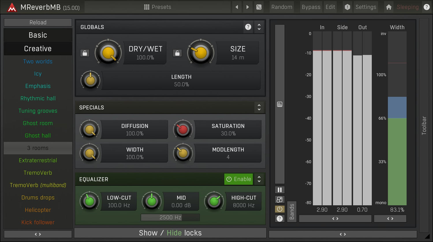 MReverbMB extends the possibilities well beyond that of standard quality reverbs by allowing you to process up to 6 distinct bands simultaneously. This reverb plugin can provide everything from extremely realistic halls to unbelievable effects.