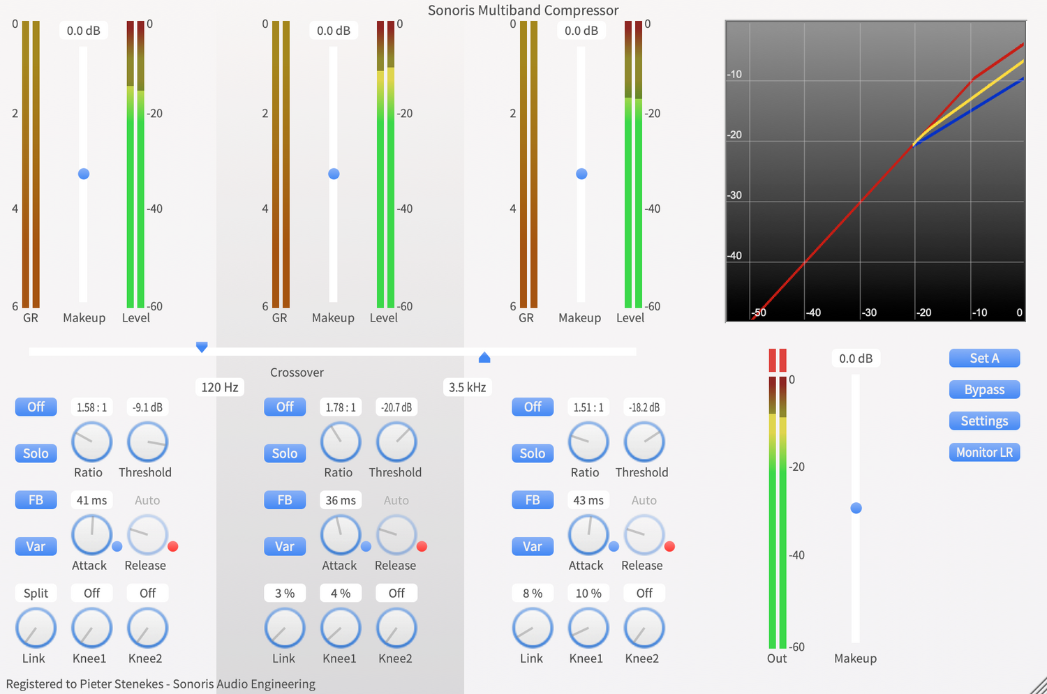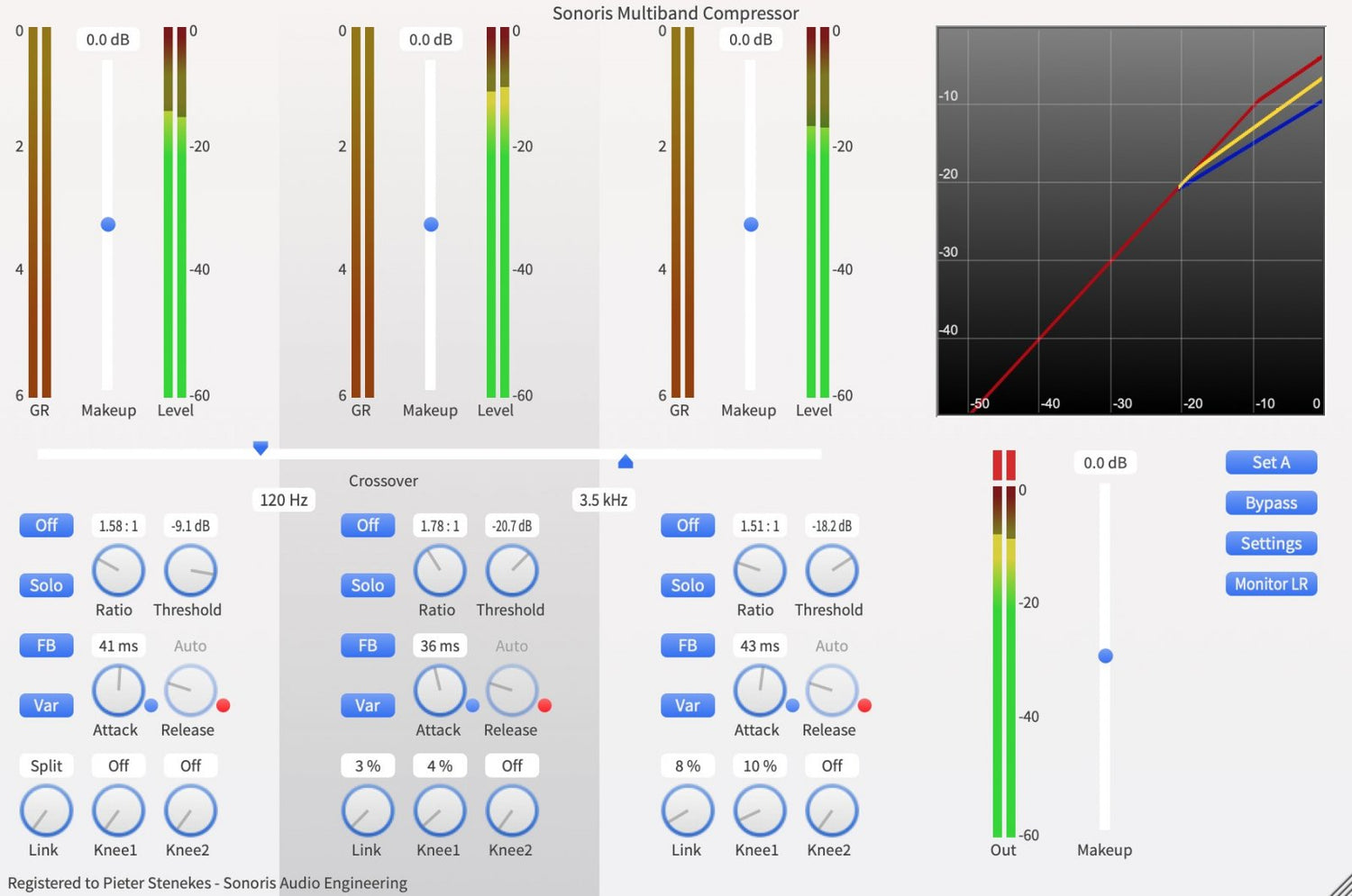 The Sonoris Multiband Compressor (=SMBC) is a versatile three band compressor in VST, VST3, AU, AAX and RTAS format for Windows and Mac. It is an ultra clean processor, suitable for delicate material. It has three independent frequency bands, each followed by a compressor based on the Sonoris Mastering Compressor. The three bands are created with carefully designed Linkwitz-Riley crossover filters to avoid phase cancellation problems while having a very natural, analog like quality. By design they mix back flat. Unlike linear phase filters they don’t introduce ringing artifacts and are more efficient in use.