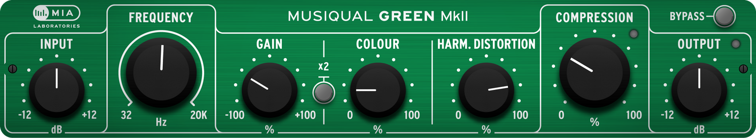 The Compressor included in the Musiqual Green plug-in is tuned to match the Transistors character. It has a fixed attack and release setting and allows for an easy way to adjust the amount of compression applied to the sound.