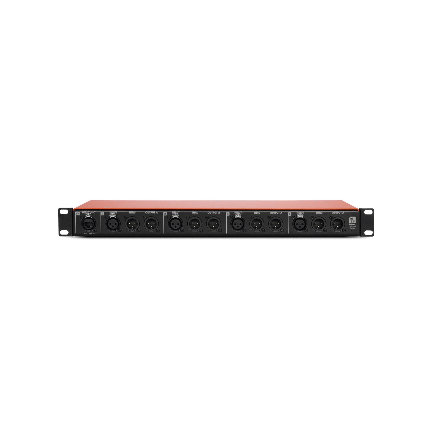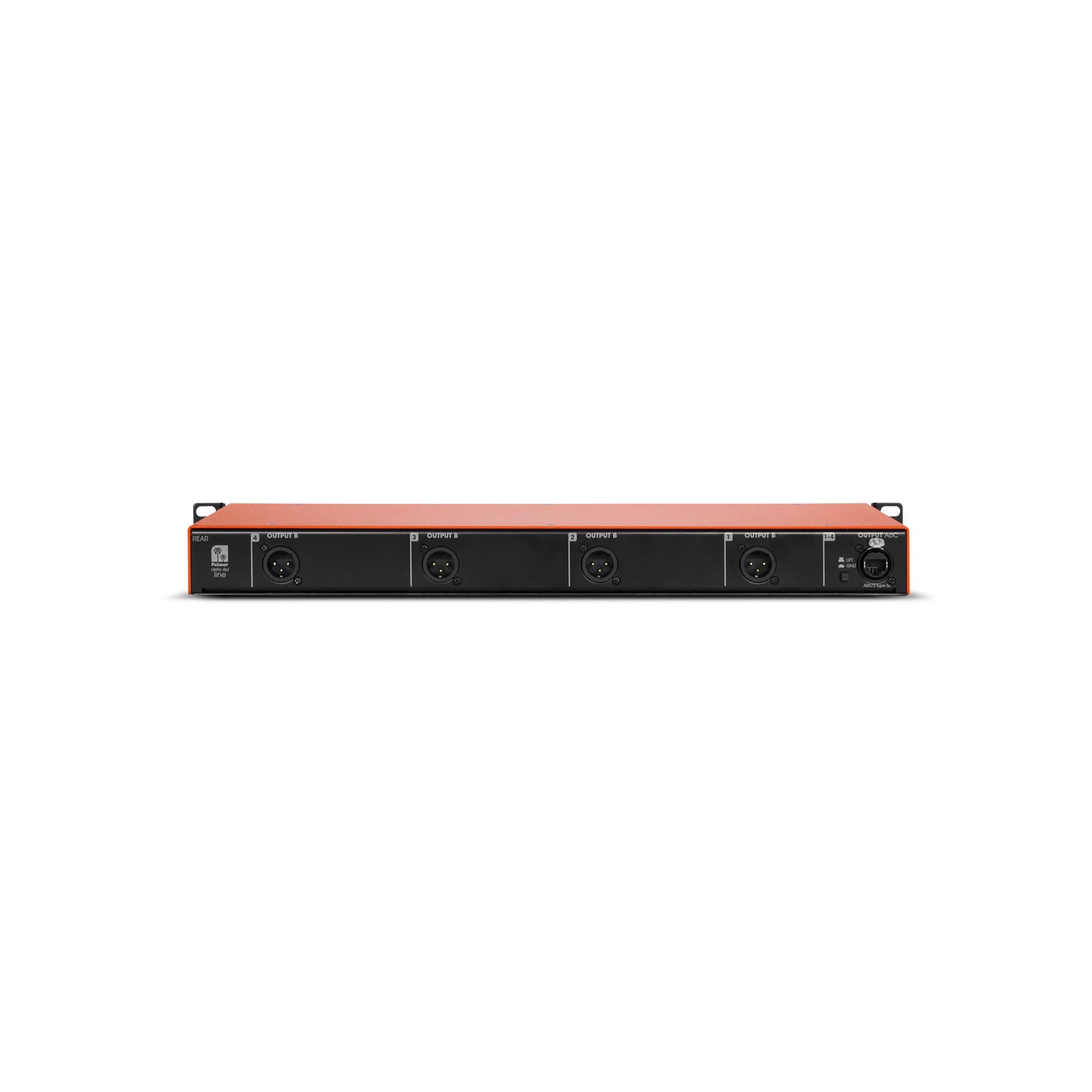 Hver af de fire kanaler har én THRU-udgang og to galvanisk isolerede, transformerbalancerede XLR-udgange. Symmetrisk signalrouting med impedanstilpasning sikrer ren transmission og eliminerer støj fra jordsløjfer. Alle 4 kanaler kan også overføres via ét enkelt Cat-kabel, hvilket er særligt nyttigt i faste installationer med begrænset eller diskret kabelføring.