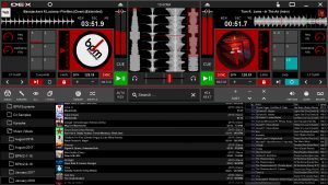 - Classic DJ setup with 2 decks, mixer and track library